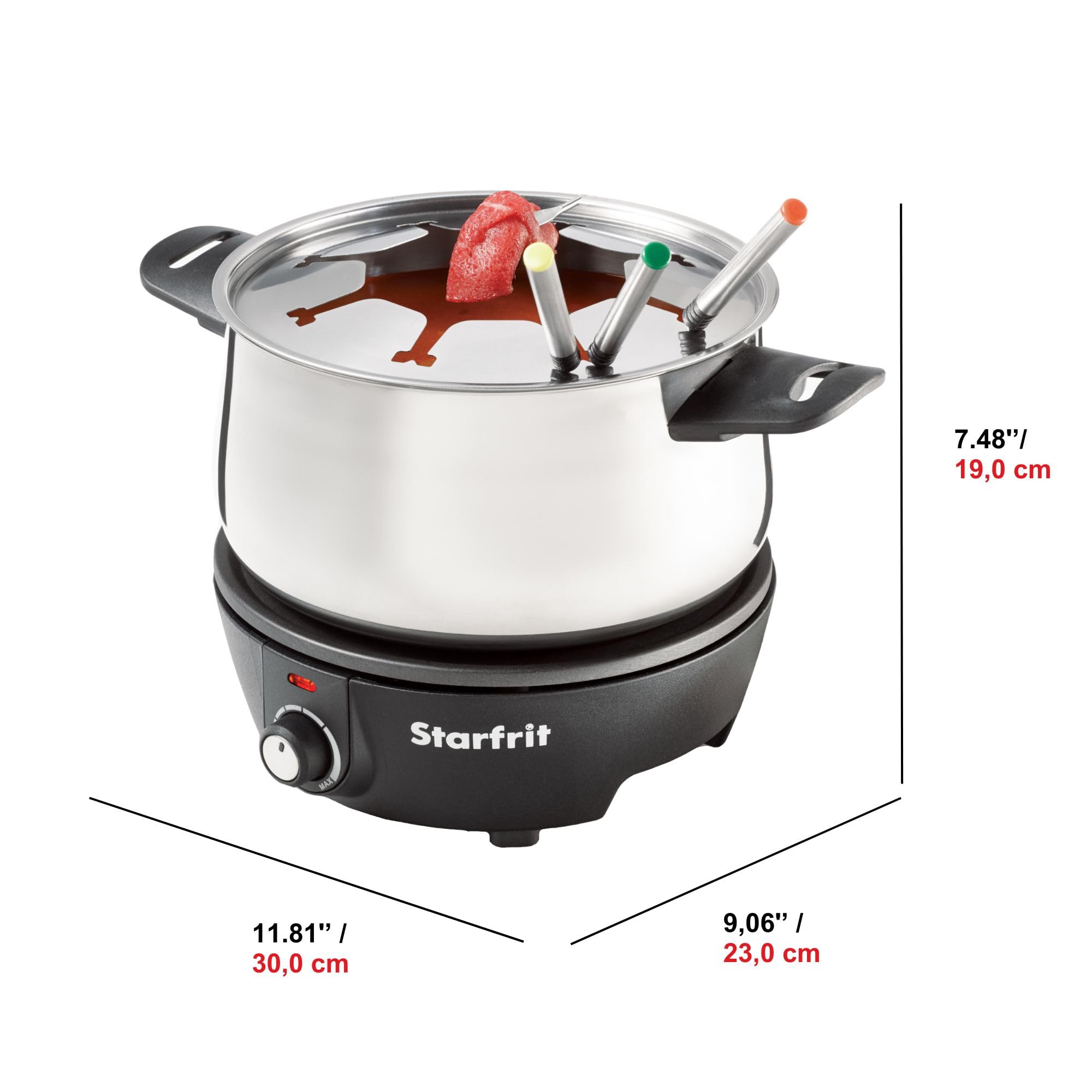 - The Starfrit 12-Piece Electric Fondue Set includes a 3L stainless steel pot with cool-touch handles.